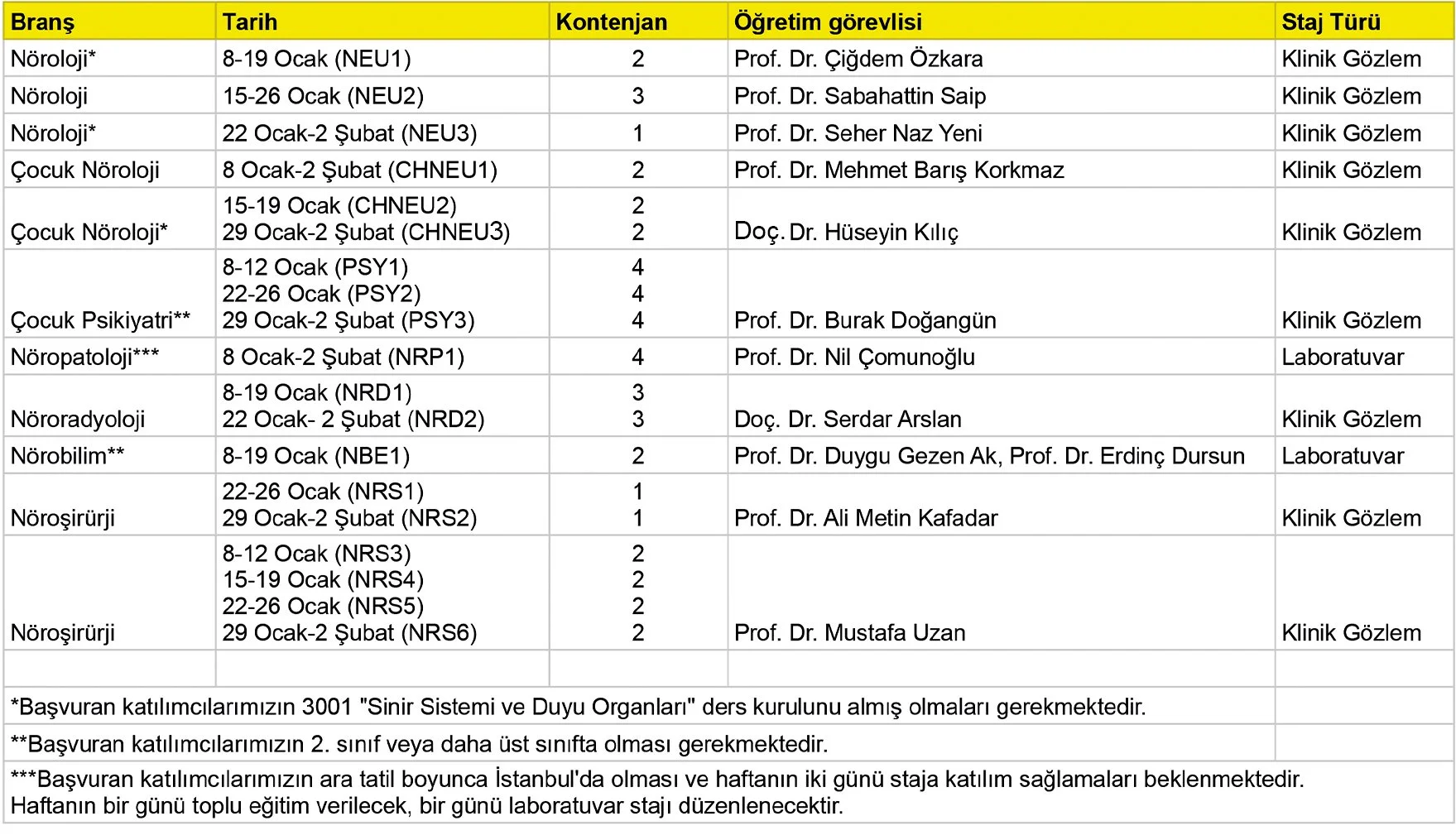 2023-2024 dönemi kış stajlarına başvurular için gerekli bilgilere aşağıdaki tablodan ulaşabilirsiniz. Son başvuru tarihi 27 Aralık’tır.