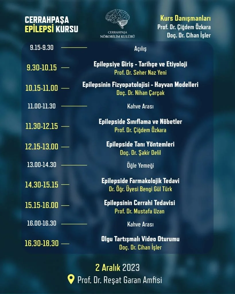 Epilepsi Kursu, Cerrahpaşa Tıp Fakültesi Cerrahpaşa kampüsünde gerçekleştirilecektir. Bilimsel programımız yanda belirtildiği gibidir ve dört büyük oturumdan oluşmaktadır. Her oturumun bir akademisyen bir öğrenci olmak üzere iki oturum başkanı olacaktır.