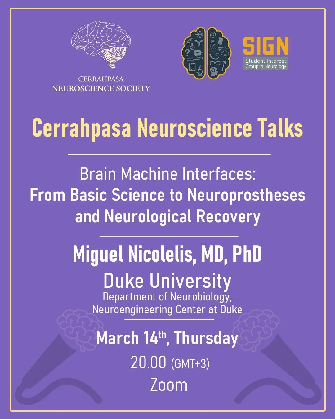 As the Cerrahpaşa Neuroscience Society and its SIGN chapter, we continue the "Cerrahpasa Neuroscience Talks" seminar series with its eighth session. Our guest speaker in this session, Miguel Nicolelis, professor of neuroscience at Duke University and founder of the Neuroengineering Center at Duke, will be talking about neuroprostheses and neurological recovery.