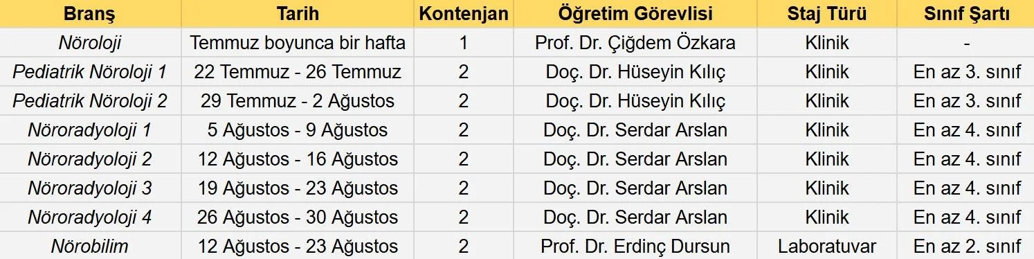 Sınıf şartı sütunu 2024-2025 itibariyle başlanacak sınıf düzeyini göstermektedir. Örneğin 2023-2024 eğitim yılında 2. sınıfı bitirmiş bir öğrenci 3. sınıf sayılmaktadır, en az 3. sınıf öğrencilerini kabul eden pediatrik nöroloji stajına başvuruda bulunabilirler.